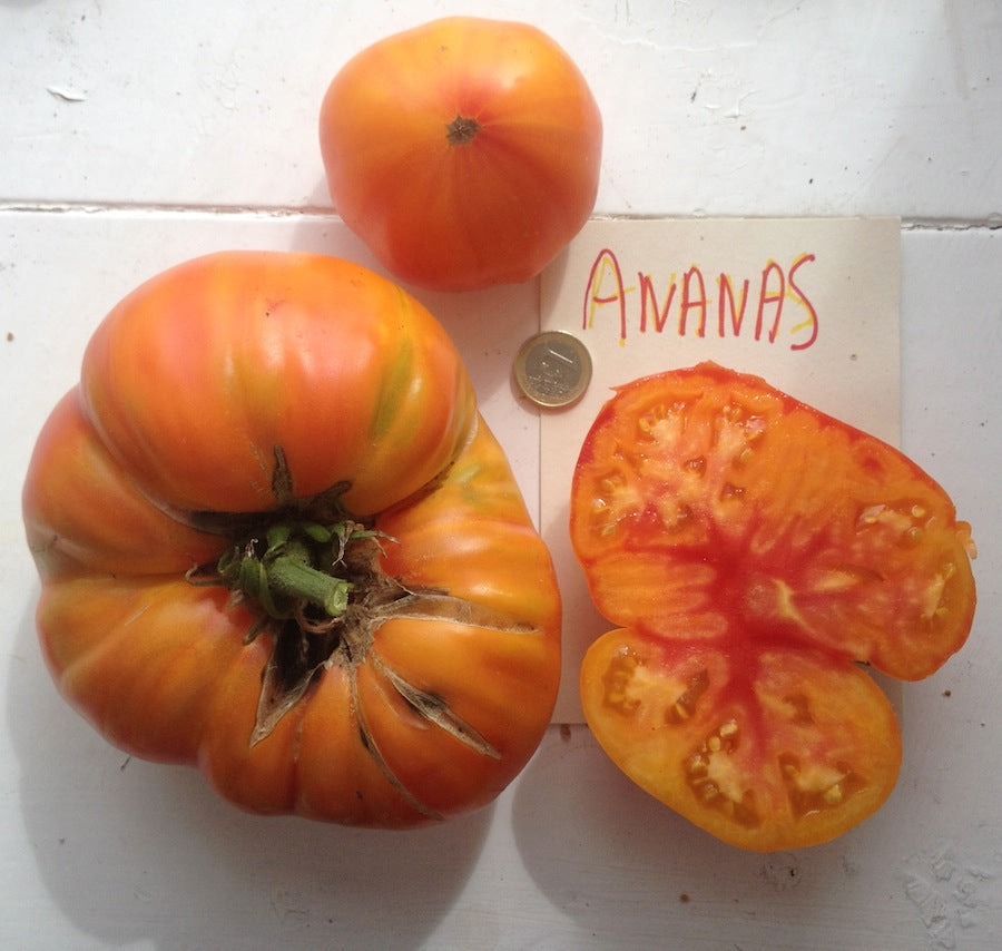 Delicious yellow orange beefsteak heirloom tomatoes with a red blush on the blossom end and some, subtle red streaking within the tomato. A great, sweet tasting heirloom tomato with just a mild presence of acidity.