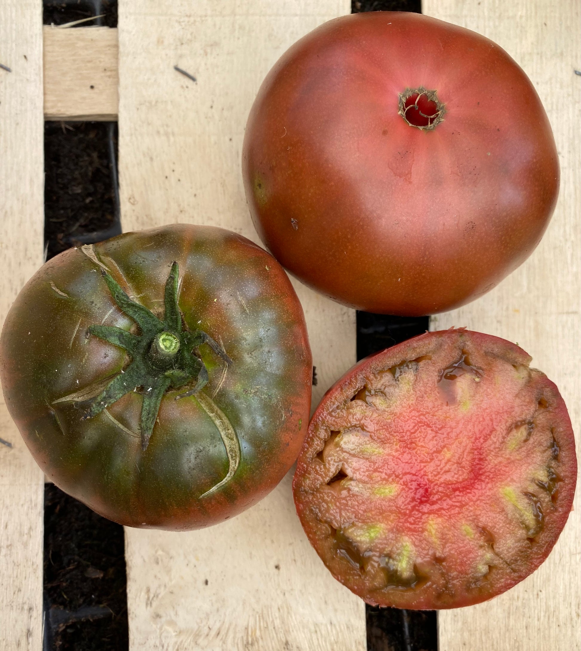 A large red-brown/red tomato that produces a heavy crop early in the season. It has a rich sweet flavour.