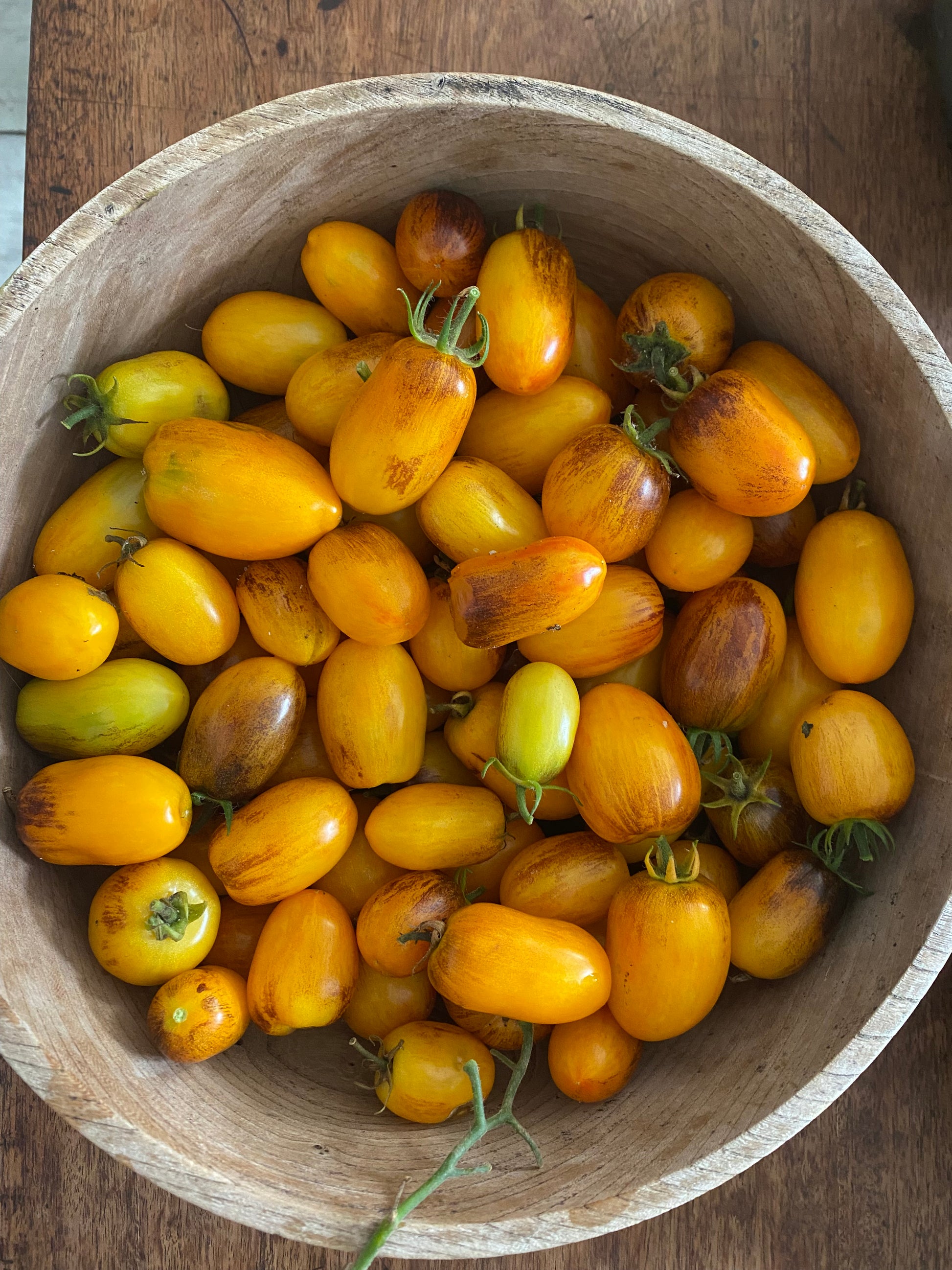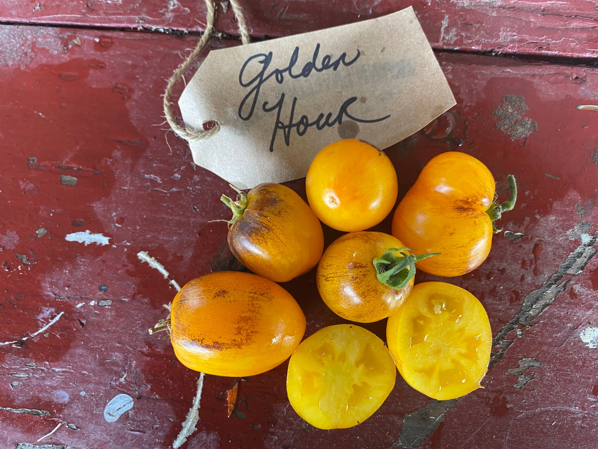 Lycopersicon esculentum Yellow tomato with a blue blush, Bush plants, produce a prolific amount small plum tomatoes, suitable for sauce. Sow from January to March. As this is an indeterminate type it needs to be supported and have its side shoots removed.