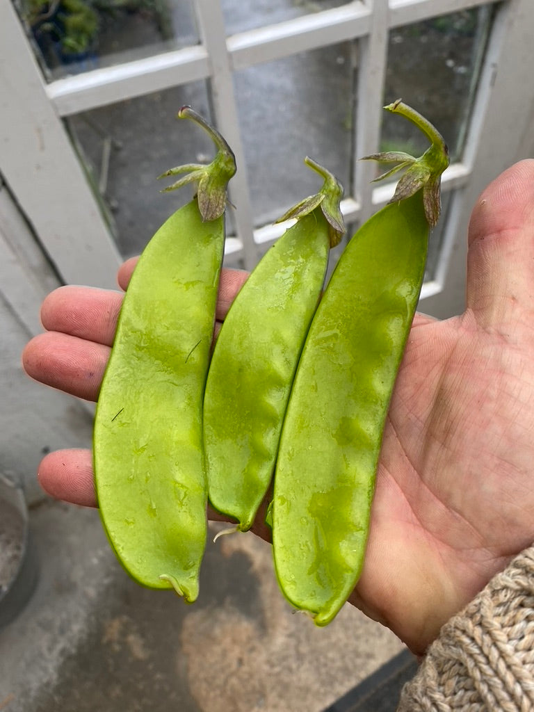 A very productive pea with pairs of large straight pods up to 10 cm long. with large sweet edible pods. Grows to about 1.2m tall. Sow undercover from February and out doors from March to June. Needs support as tendrils appear. Grows to about 1.5m