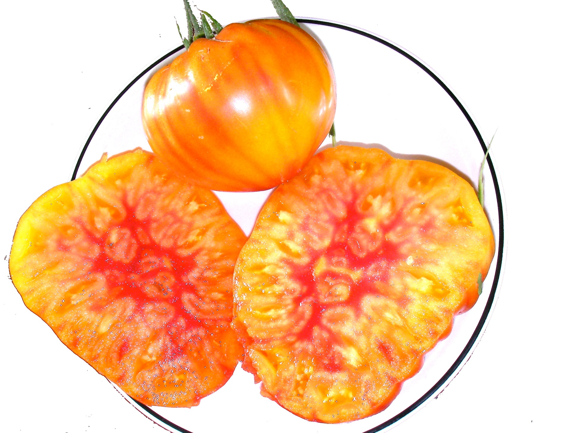 Very large, brilliant yellow colour with red marbling, beautiful when sliced. An heirloom believed to be from West Virginia. It has a rich, sweet flavour.