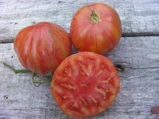This Australian heirloom has slightly elongated 1” tomatoes They are bright red and prolific with excellent flavour and plenty of juice. It produces over a long seasonA heart-shaped pink and gold striped tomato, with a delicate flavour.