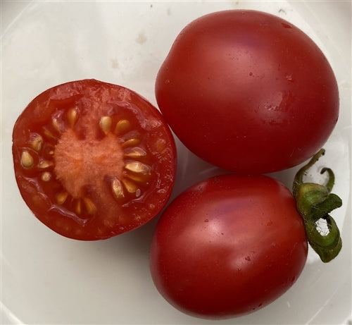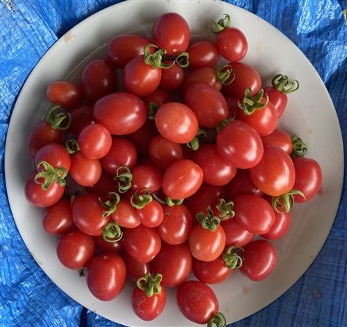 Pink, grape-shaped cherry tomatoes, with a sweet/tart flavour. They did well both under cover and outdoors in 2022. We haven't had a frost yet so its hard to know if they are actually frost hardy, but they do yield late into the season.