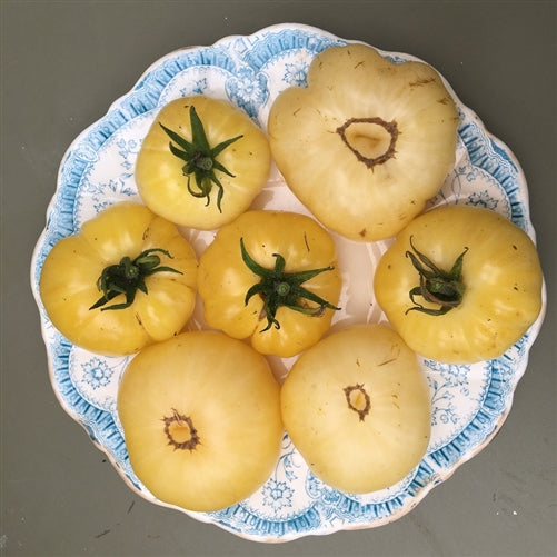 This almost white medium sized beefsteak variety, was given to us by Derek Dunne. It is prolific and tasty. Sow from January to March. As this is an indeterminate type it needs to be supported and have its side shoots removed. Harvest July on.